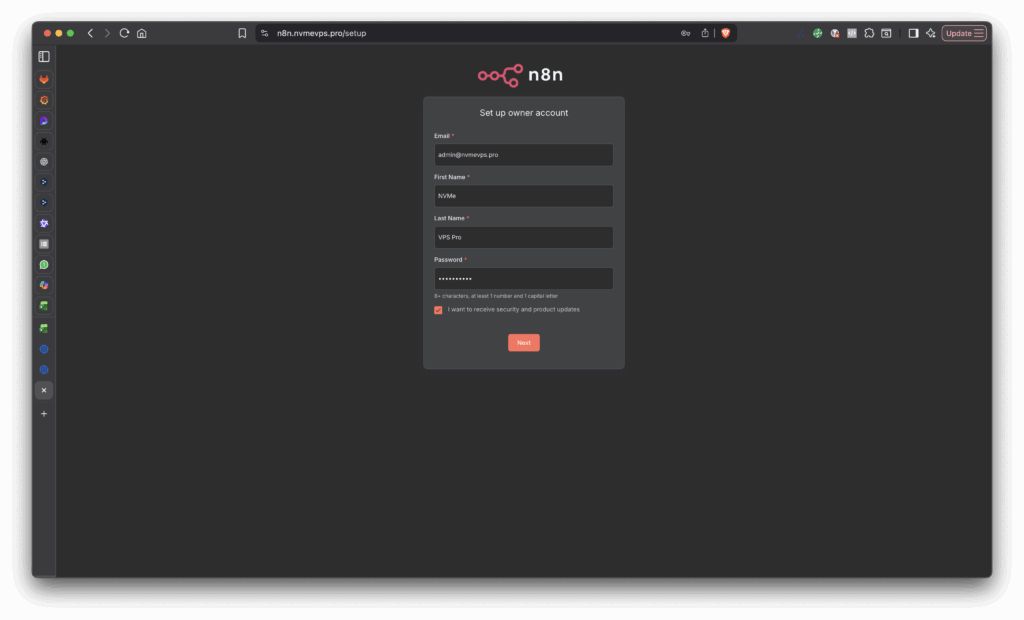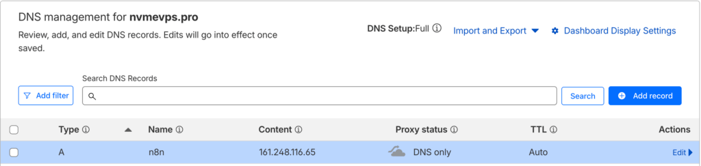 Jika sudah pastikan subdomain n8n.nvmevps.pro sudah diarahkan ke IP Publik NVMe VPS Pro