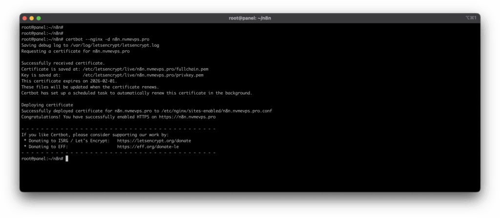 root@panel:~/n8n# certbot --nginx -d n8n.nvmevps.pro