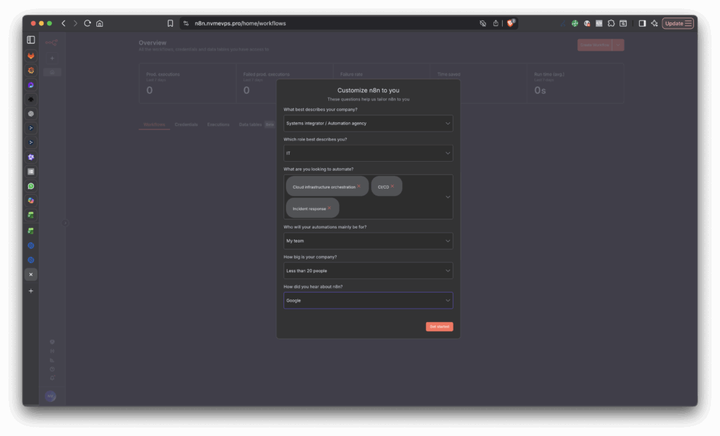 Kemudian, Anda diminta memilih tujuan menggunakan n8n di peruntukan untuk kebutuhan apa jika sudah klik Get started