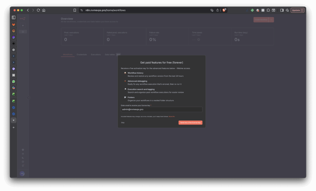 Gambar diatas Anda akan mendapatkan lisensi n8n yang dapat Anda gunakan, silakan input email valid yang bisa Anda gunakan dan berikut tampilan dari n8n