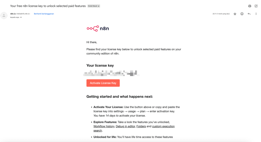 Selanjuntnya, cek email Anda dan lihat apakah sudah tersedia license n8n jika sudah Anda akan menerima informasi seperti gambar di bawah ini