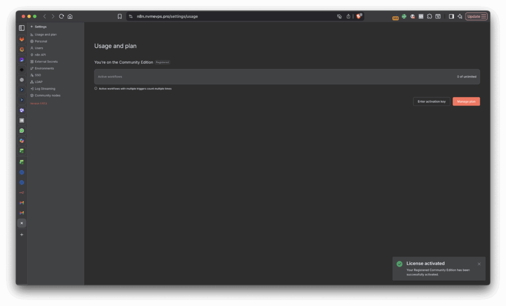 Apply license key n8n dengan cara klik Activate License Key maka secara otomatis akan ter apply seperti gambar di bawah ini