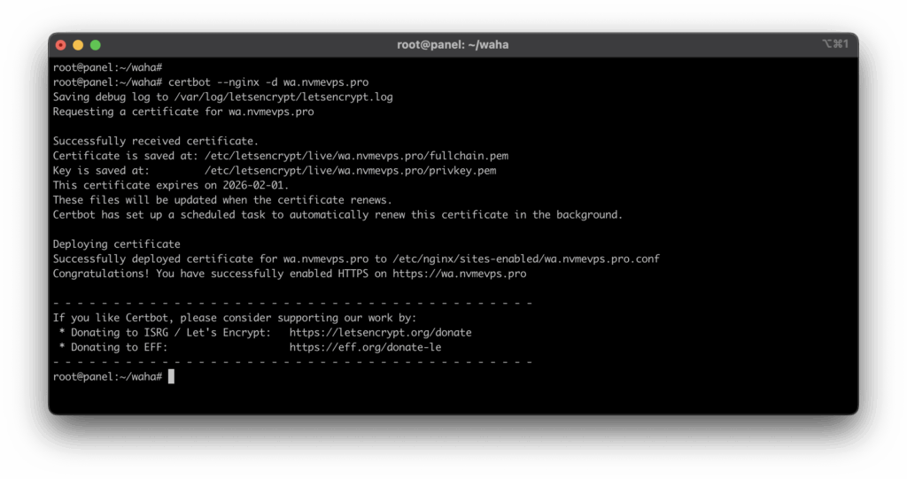root@panel:~/waha# certbot --nginx -d wa.nvmevps.pro