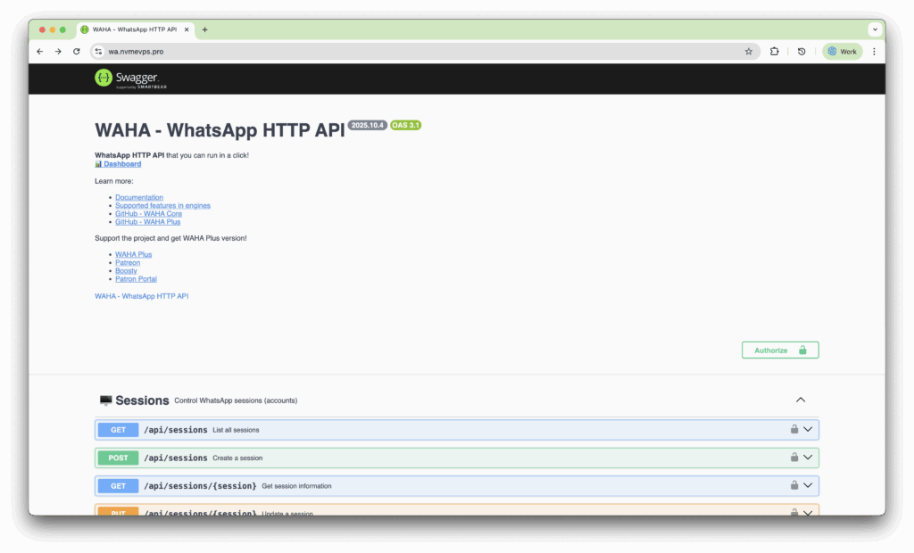 WAHA (WhatsApp HTTP API) adalah solusi self-hosted WhatsApp API yang memungkinkan Anda menjalankan integrasi WhatsApp secara cepat dan mudah cukup dengan satu kali klik.