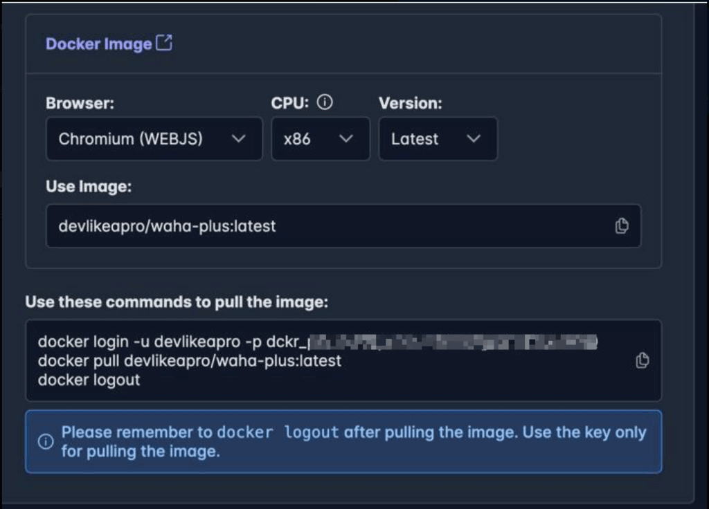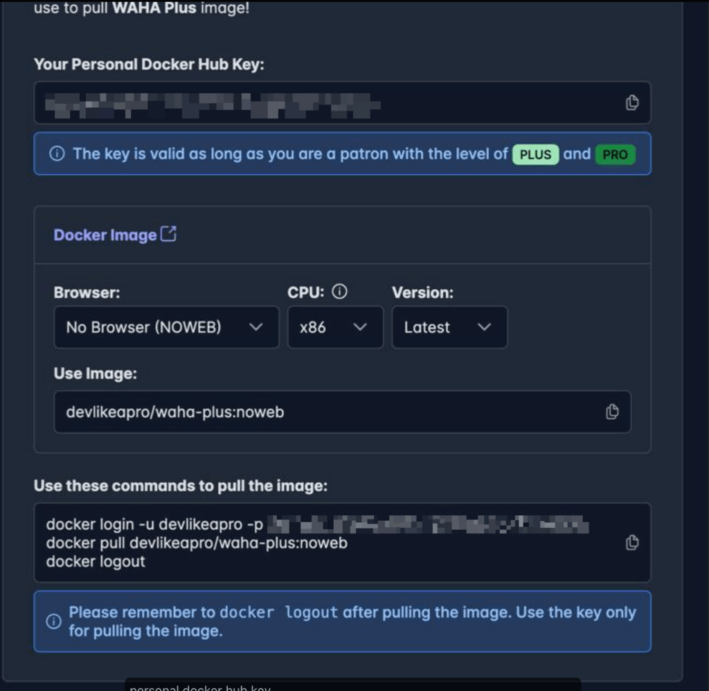 Jika Anda ingin melakukan upgrade version dari core ke plus silakan subscribe terlebih dahulu WA Plus jika sudah nanti Anda dapat melakukan upgrade dengan 3 langkah saja yang pasti Anda akan mendapatkan informasi untuk login ke private images WAHA Plus contohnya seperti gambar di bawah