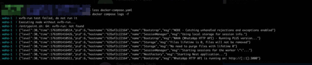 Cek log pastikans udah running menggunakan WAHA Plus