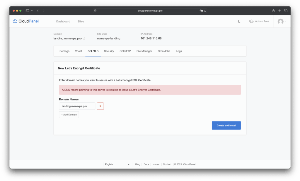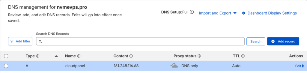 Silakan akses IP Public VPS beserta port default dari CloudPanel 8443 atau jika Anda sudah mempunyai nama domain atau subdomain misal cloudpanel.nvmevps.pro Anda dapat melakukan pointing A record IP Public VPS ke subdomain Anda contoh seperti gambar di bawah ini