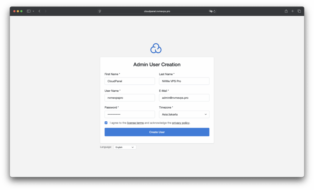 Jika sudah silakan akses di browser Anda, maka akan nampak seperti gambar di bawah ini dimana Anda diminta untuk setup user Admin CloudPanel
