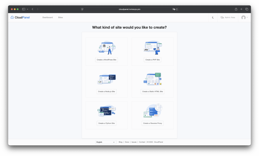 Di CloudPanel Anda dapat melakukan hosting beberapa website dengan stack yang berbeda beda misalkan website menggunakan PHP atau NodeJS atau Python atau hanya sekedar diperuntukkan sebagai Nginx Reverse Proxy juga dapat dilakukan detail penambahan site di CloudPanel dapat dilihat pada link berikut : CloudPanel Site