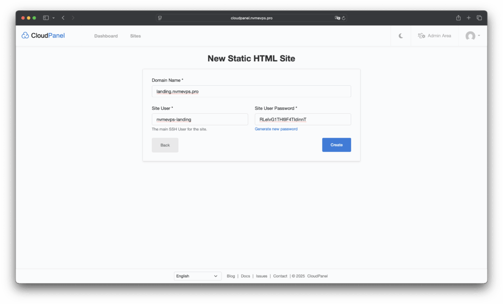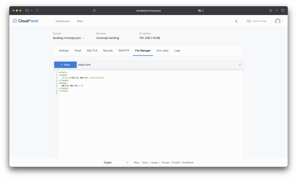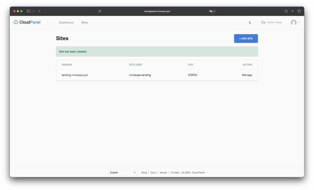 Sampai tahap ini Anda sudah berhasil melakukan instalasi CloudPanel dan Host website static Anda juga dapat mencoba secara mandiri untuk fitur fitur lain yang tersedia di CloudPanel