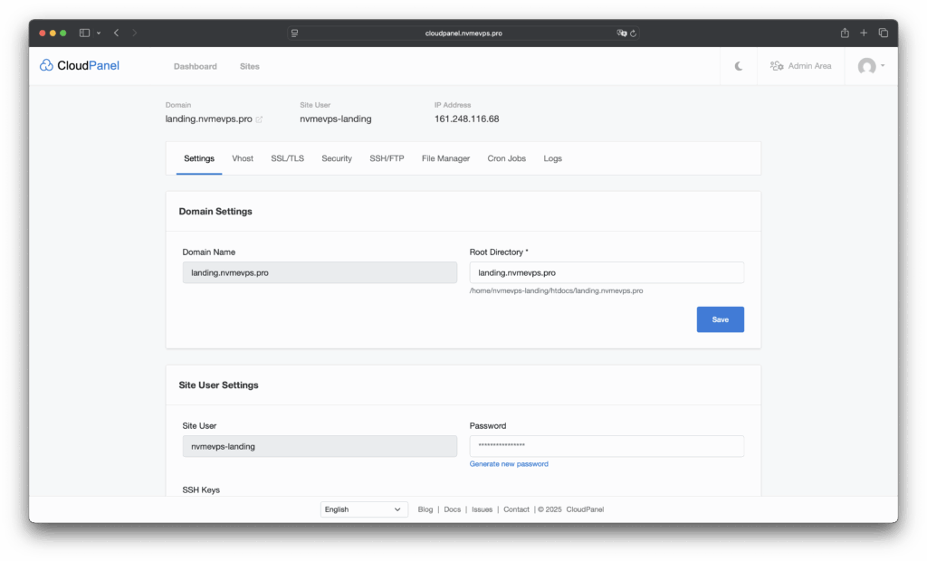 Pada menu ini Anda dapat mengatur dan mengelola site yang sudah Anda buat mulai dari konfigurasi site itu sendiri, virtual host, SSL, Security, SSH/FTP, File Manager dan pengaturan CronJobs serta Logs dari site itu sendiri.