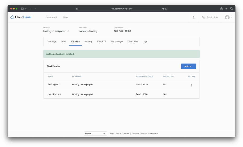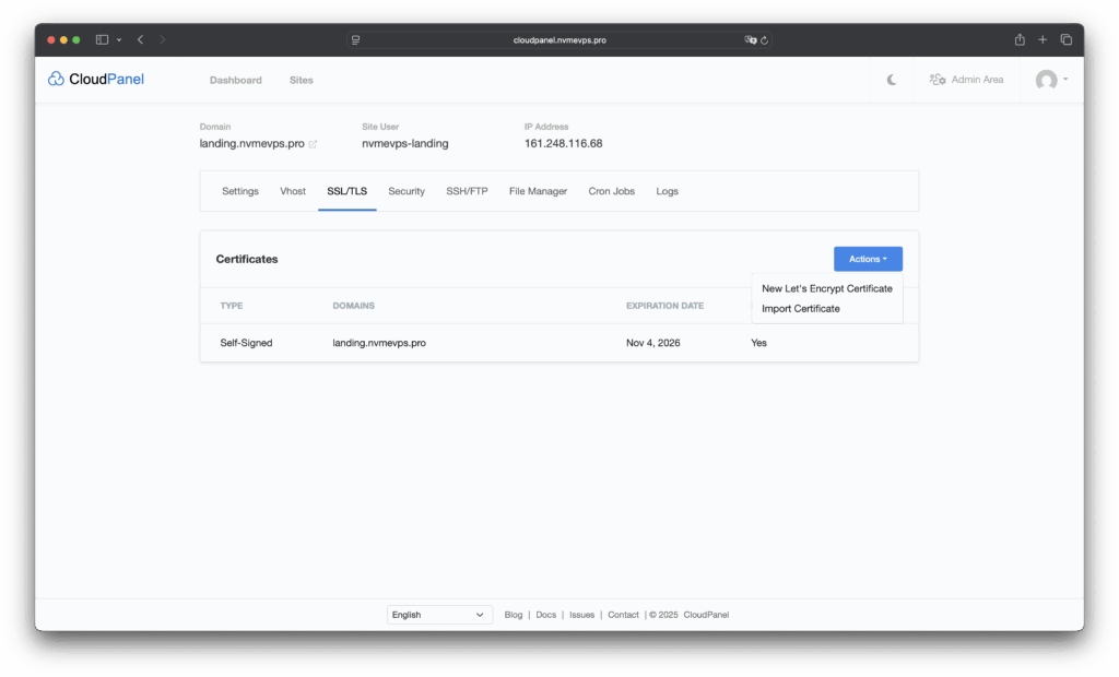 Secara default untuk SSL menggunakan self-signed, silakan klik Action kemudian klik New Let’s Encrypt Certificate untuk generate SSL pastikan domain sudah di tambahkan A record ke IP CloudPanel